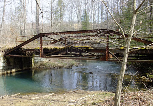 This old bridge, overgrown and unsteady, is on an unknown, unused road paralleling US-23 at 36.92224, -82.689321, between Appalachia and Norton VA. It was built well, with an asphalt bed and solid concrete abutments.